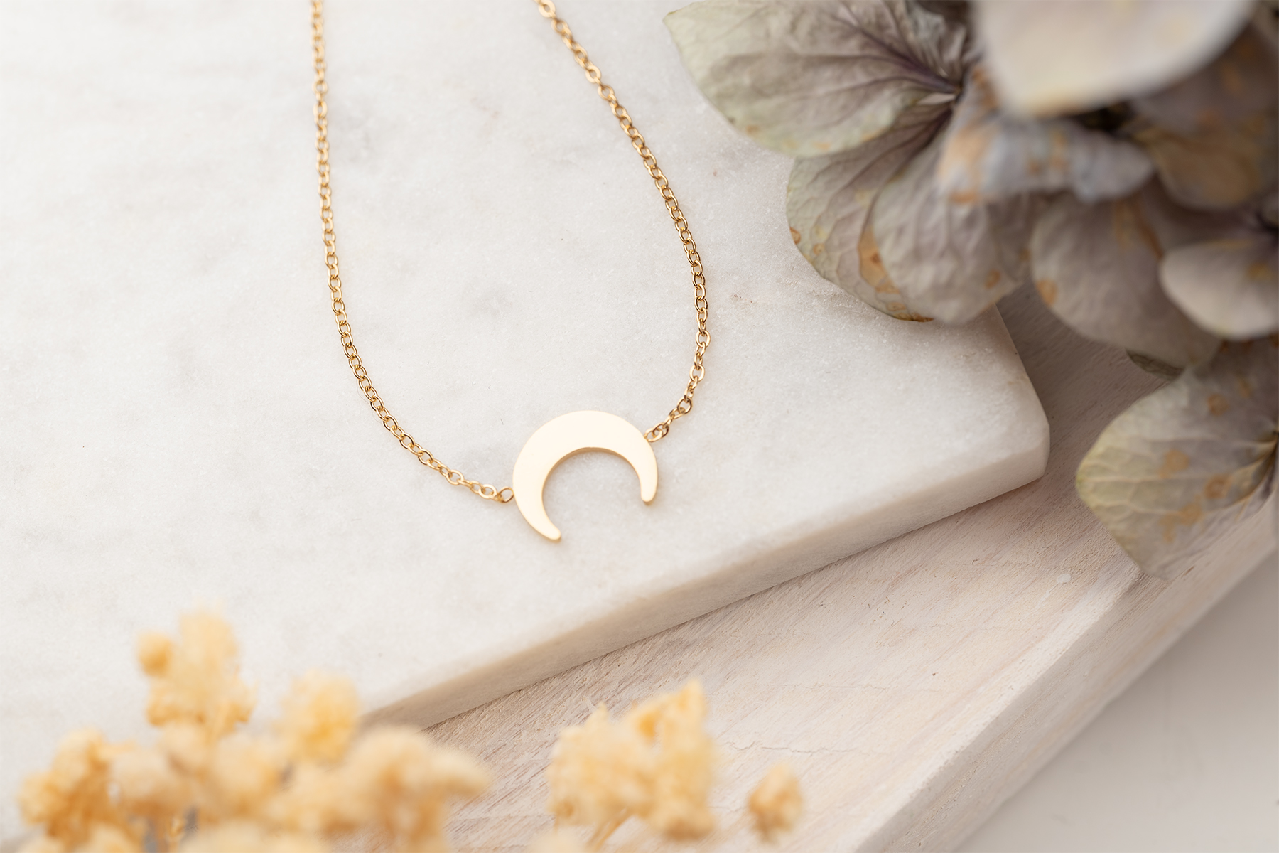 Naszyjnik „Tiny Moon” – złota lunula ze stali szlachetnej (40–45,5 cm). Subtelny, minimalistyczny talizman, symbol intuicji i kobiecej energii.